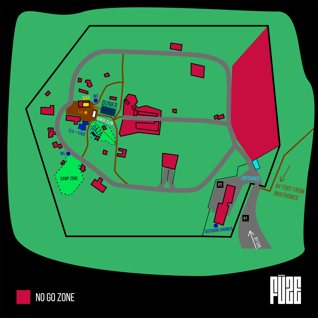 To reach Fúze areal from Zličín (metro B), you can take bus 386 to Bratronice, which takes approximately 40 minutes. From Bratronice, it’s a 1-2 kilometers walk to Fúze areal.